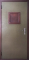 Дверь изготовлена из стали толщиной 2 мм, снаружи и изнутри отделана порошковым напылением. Установлено две петли диаметром 20 мм, откидное окно для выдачи и два врезных замка, в дверной блок монтируются противосъемные блокираторы. Модель подойдет для установки на предприятиях в качестве кассовой двери.